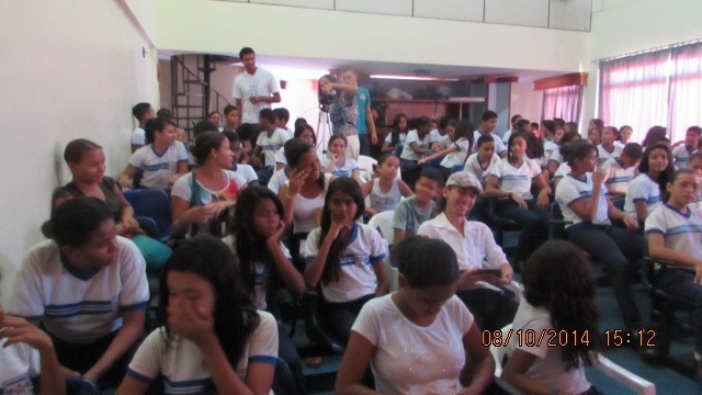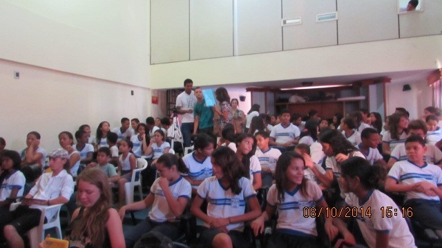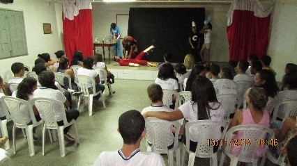 Figuras: público estudantil apreciando a apresentação cênica da peça: Os vingadores da Química.